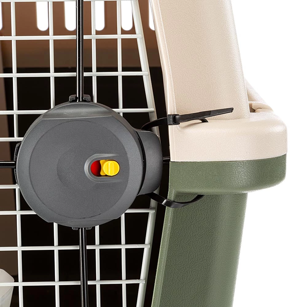 Die GittertĂŒr der Transportbox hat 25 x 25 mm groĂe GitterabstĂ€nde und entspricht somit den geltenden IATA-Vorschriften fĂŒr den Transport von Haustieren im Flugzeug.