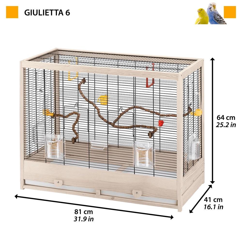 Giulietta 6 ist ein Vogelheim fĂŒr Kanarienvögel oder kleine Exoten, in einem puristischen Design, das sich durch eine Struktur mit SĂ€ulen und Rahmen aus robustem Holz, FSCâą -zertifiziertem, auszeichnet, aus WĂ€ldern, die nach strengen ökologischen, sozialen und wirtschaftlichen Standards verantwortungsbewusst bewirtschaftet werden und anderen kontrollierten Quellen. Das Holz wird durch einen ökologisch unbedenklichen und schimmelhemmenden ImprĂ€gnierlack geschĂŒtzt und so UV-StrahlungsbestĂ€ndig und wasserabweisend ist. Dieser Lack wird mittels Flow-Coating-Technologie aufgetragen und verlĂ€ngert die Produkthaltbarkeit ĂŒber einen groĂen Zeitraum.
