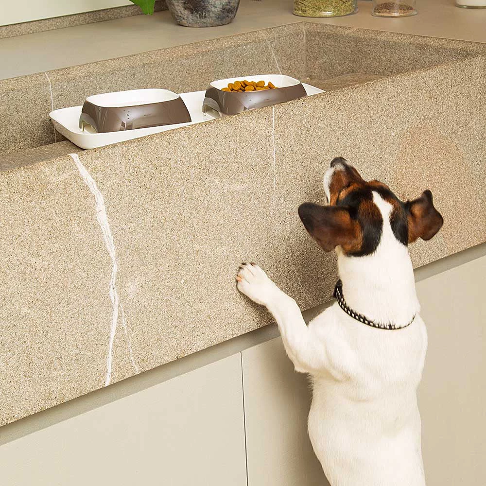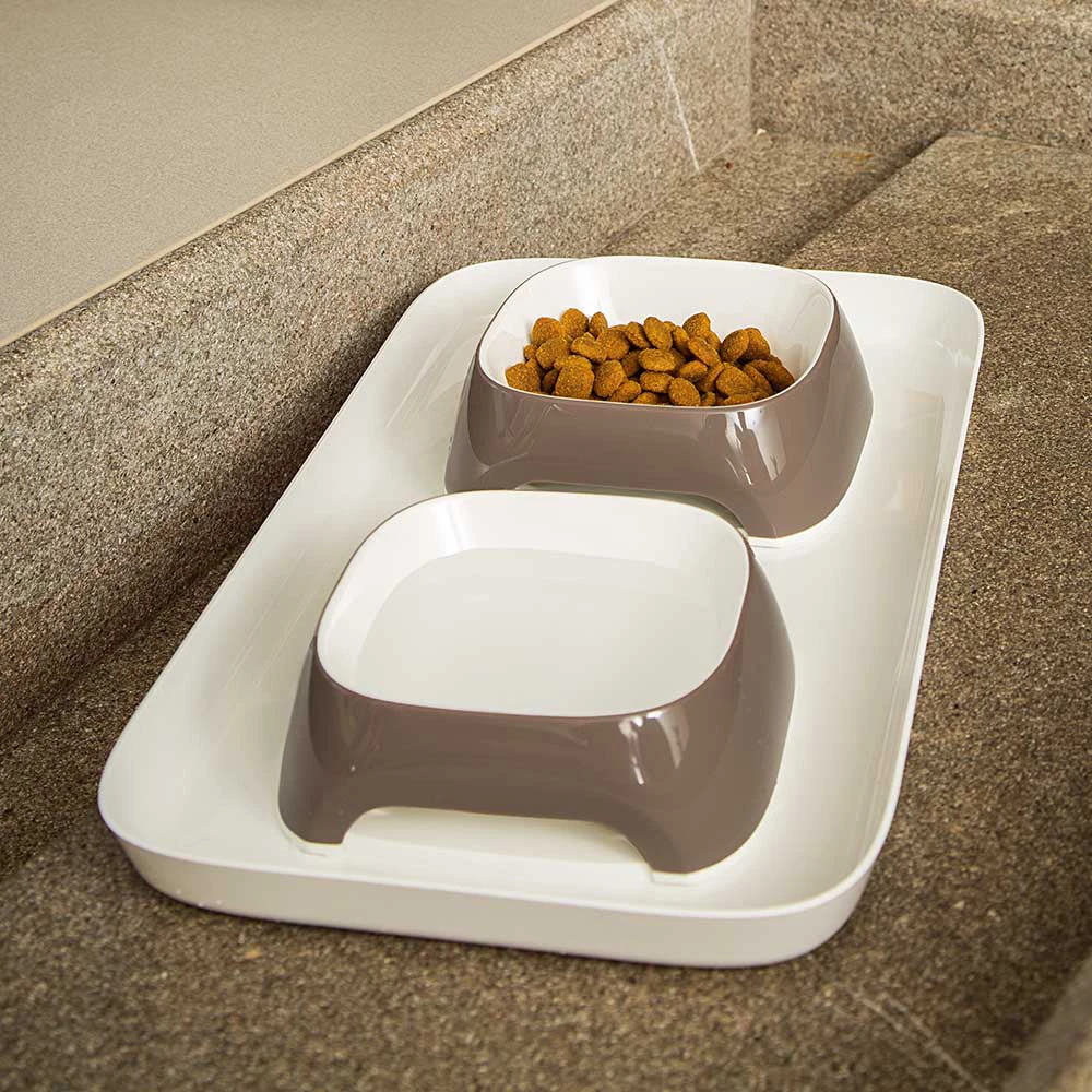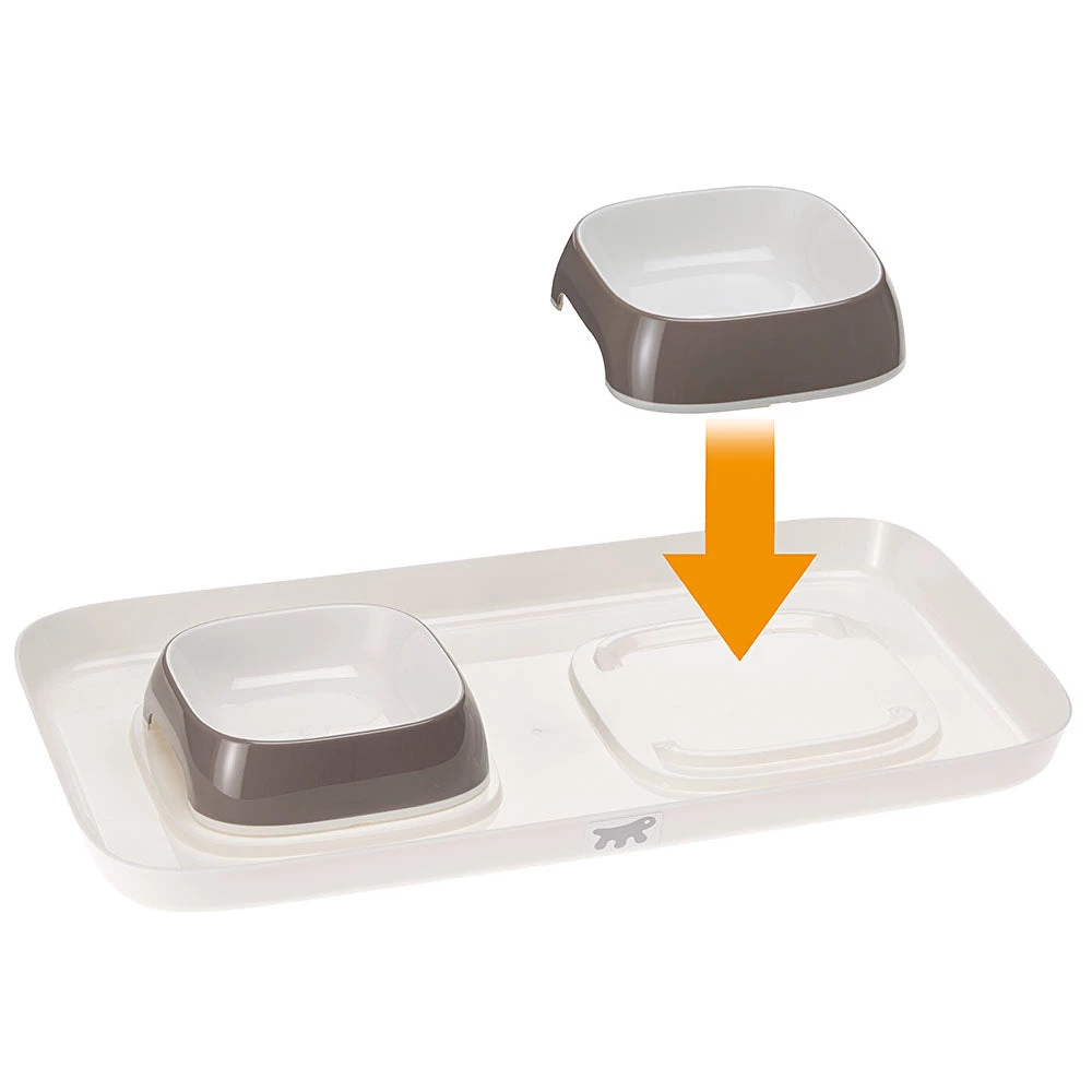Stilvoll Essen? Einfach dank Glam Tray, dem Tablett mit Futterschalen fĂŒr Hunde und Katzen. In modischen Farben, mit einem glĂ€nzenden Effekt Ă€hnlich wie Keramik, verbindet Glam Tray Ăsthetik und FunktionalitĂ€t. Die erhöhten SeitenwĂ€nde verhindern das Herausfallen von Wassertropfen oder Nahrung auf den Boden und erhalten so Hygiene und Ordnung in Ihrem Zuhause. Das Tablett aus hochwertigem weiĂem Kunststoff verfĂŒgt ĂŒber nĂŒtzliche rutschfeste FĂŒĂe, die fĂŒr maximale StabilitĂ€t wĂ€hrend der FĂŒtterung sorgen.