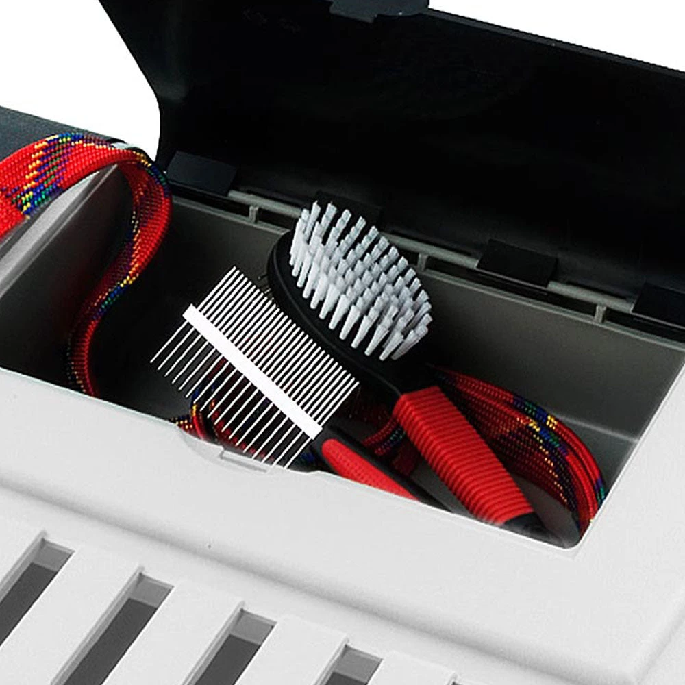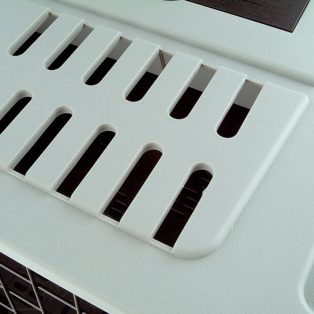 Alle Modelle sind mit einem Sicherheitsverschluss und einer SchiebetĂŒr versehen, die sich in beide Richtungen öffnen lĂ€sst. Die groĂzĂŒgigen LĂŒftungsschlitze sorgen fĂŒr eine ausreichende Luftzirkulation und die passende Drainagematte hĂ€lt den Innenraum der Box trocken. Die seitlichen Eingriffe am Oberteil erleichtern ein Verschieben der Box oder auch die Entnahme der Box aus dem Auto.