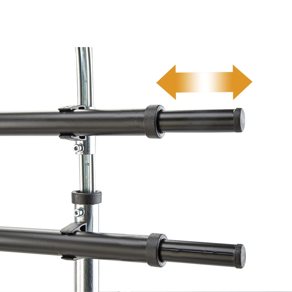 Heben Sie die KopfstĂŒtzen an, um die StĂŒtzstreben zugĂ€nglich zu machen. lockern Sie die untere Verschraubung an den beiden TrennstĂ€ndern und biegen Sie sie um etwa 90 °. Befestigen Sie die Pfosten an den freiliegenden StĂŒtzen der KopfstĂŒtzen und ziehen Sie sie mit dem mitgelieferten InbusschlĂŒssel fest. Stellen Sie die beiden Pfosten auf die gewĂŒnschte Höhe ein und sichern Sie diese mit dem InbusschlĂŒssel. Fixieren Sie die korrekte Neigung der Pfosten mit den zwei Drehknöpfen. Haken Sie nun die Teleskoprohre an den beiden StĂŒtzstreben ein und stellen Sie deren LĂ€nge ein (die Fixierung / Entsperrung erfolgt durch Drehung der beiden Rohre).