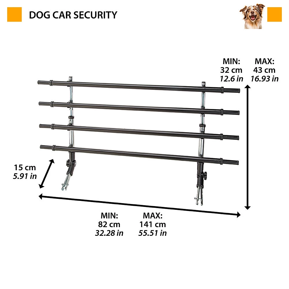 Universal geeignet fĂŒr alle Kombi-Autotypen, Dog Car Security trennt den Kofferraum des Autos von der restlichen Fahrgastzelle und ermöglicht so den Hund sicher zu transportieren, ohne das dieser die Fahrt stört. Robust und verlĂ€Ălich, da aus lackiertem Edelstahl. Die Abtrennung kann einfach an den hinteren KopfstĂŒtzen befestigt werden und an die Breite und Höhe des Zwischenraumes von Kofferraum und Fahrgastzelle angepasst werden. Made in Italy. MaĂe: mind. 82 x 15 x 32 cm Höhe, max. 141 x 15 x 43 cm Höhe.