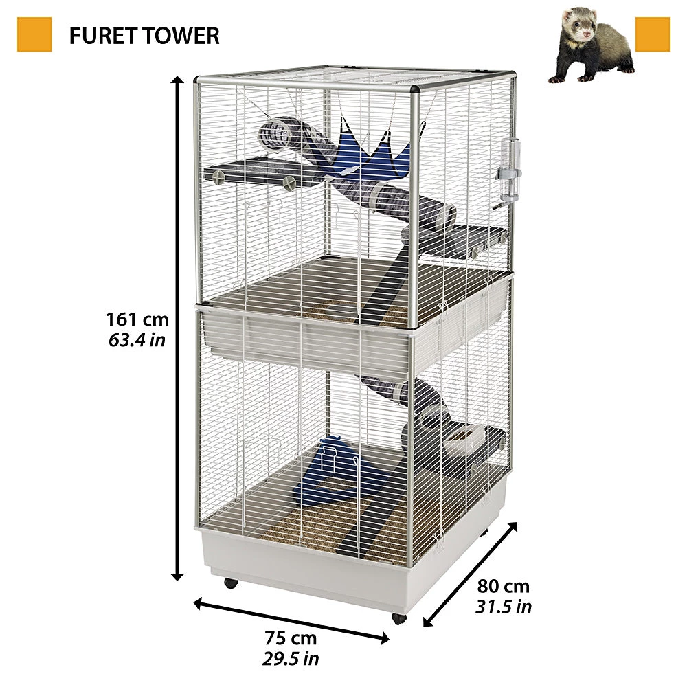 Ein Nagerheim mit vielen Ebenen fĂŒr lebhafte Tiere! Furet Tower ist ein besonders gerĂ€umiges Frettchenheim, das Ihr Haustier mit groĂer Freiheit versorgt und ihm ermöglicht, sich weitrĂ€umig zu bewegen. Es besteht aus zwei Plastikschalen, die auf einer stabilen Kunststoffkonstruktion aufbauen. Die Metallverdrahtung ist lackiert. Dieses Heim bietet Ihrem Frettchen eine Menge Spielmöglichkeiten. Durch die mitgelieferten Röhren können die einzelnen Ebenen problemlos erreicht werden. Das Heim wird komplett mit Zubehör ausgeliefert: Frettchen-Toilette, eine Trinkflasche, Plastiknapf, Ecketagen mit Leitern und HĂ€ngematte.