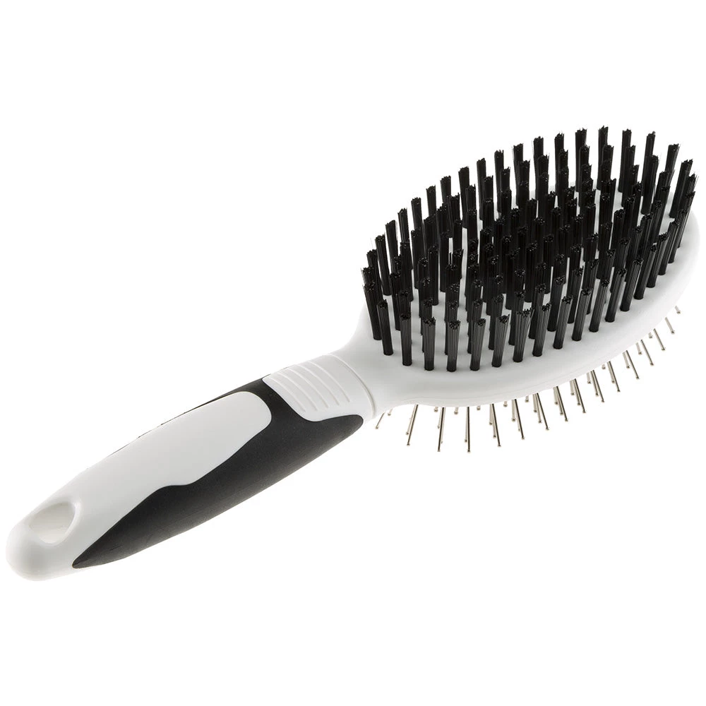 FĂŒr die Pflege Ihres vierbeinigen Freundes gibt es die BĂŒrste GRO 5763, auf der einen Seite mit Edelstahlborsten und auf der anderen Seite mit weichen Polyamidborsten, die dem Fell Glanz und Weichheit verleihen und das KĂ€mmen erleichtern. Die Edelstahlborsten haben ihrerseits abgerundete Spitzen um die empfindliche Haut des Hundes nicht zu reizen oder zu verletzen. Knoten und Schmutz werden effektiv entfernt und gleichzeitig sanft massiert. Praktisch und einfach in der Anwendung, ist diese BĂŒrste fĂŒr Hunde auch dank des innovativen ergonomischen Griffes, der mit Gummi ĂŒberzogen ist und fĂŒr maximalen Komfort und einen festen und sicheren Halt wĂ€hrend der Pflege sorgt. Die hochwertigen und widerstandsfĂ€higen Materialien verleihen dem Produkt eine lange Lebensdauer und StabilitĂ€t.