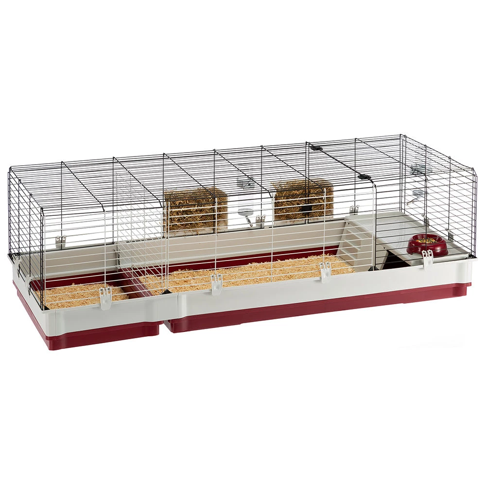 Das Modell Krolik 160 ist sehr gerĂ€umig, ideal fĂŒr die gleichzeitige Unterbringung mehrerer Kaninchen und mit allem Komfort ausgestattet: Im Inneren befindet sich ein komfortables Kunststoffhaus mit einem Napf, einer Heuraufe und einer Trinkflasche. Der Lebensraum ist ideal, um mehrere Kaninchen unterzubringen: Dank eines speziellen herausnehmbaren Gitters können zwei separate Bereiche gestaltet werden, in denen die Kaninchen Nester in ihrem eigenen Bereich bauen können, sodass sie die nötige Sicherheit haben. Der Boden des KĂ€figs kann mit groĂer Leichtigkeit gelöst werden, wobei eine vollstĂ€ndige Sicherheit gewĂ€hrleistet ist, da die kĂŒrzlich neu gestalteten Befestigungsklammern das Entweichen des Tieres verhindern und zudem zuverlĂ€ssig und einfach zu bedienen sind.