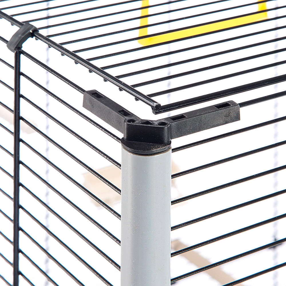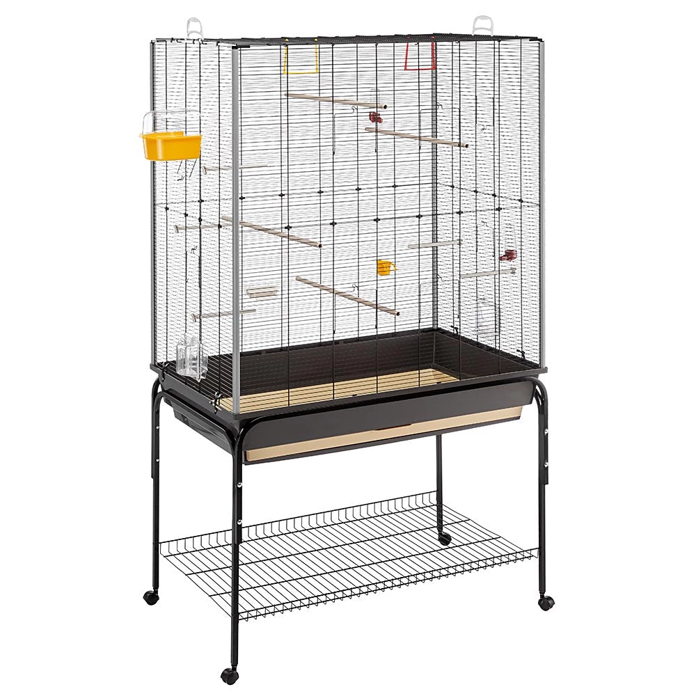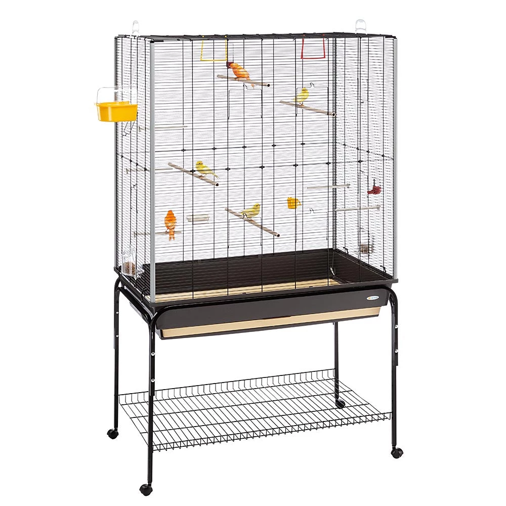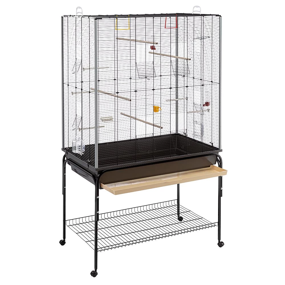 KĂ€figabmessungen ohne Wagen: Höhe 116,5 cm. KĂ€figlĂ€nge: 97,8 cm einschlieĂlich der VorsprĂŒnge des Futtertrogs.