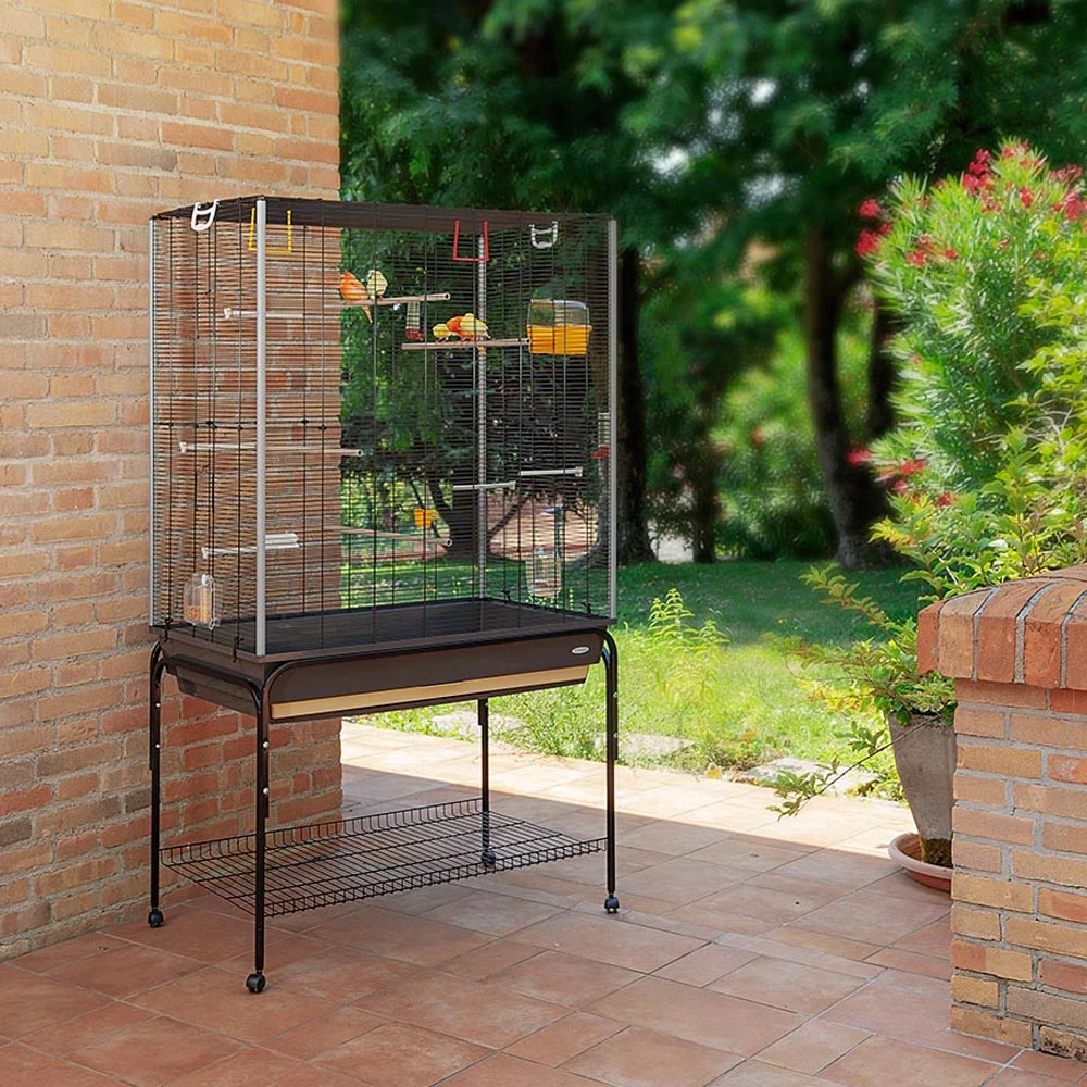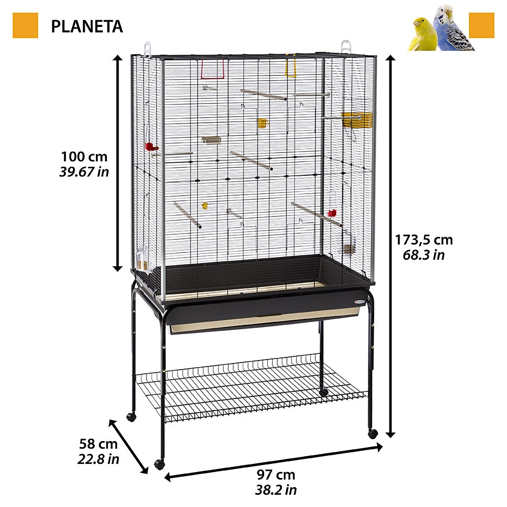 Planeta ist eine sehr groĂe und gerĂ€umige Vogelvoliere fĂŒr Kanarienvögel, Sittiche und andere kleine Vögel. Sie zeichnet sich durch ein klares und existinzielles Design aus und besteht aus lackiertem Metallgitter mit Kunststoff-SeitensĂ€ulen. Der Lebensraum wird komplett mit einem Unterstand aus Metall auf RĂ€dern und einem Ablagefach geliefert. An der Oberseite des KĂ€figs ermöglichen bequeme Griffe eine einfache Bewegung der Voliere. Am Dach befinden sich spezielle Befestigungsklammern aus Kunststoff, die fĂŒr mehr StabilitĂ€t sorgen.