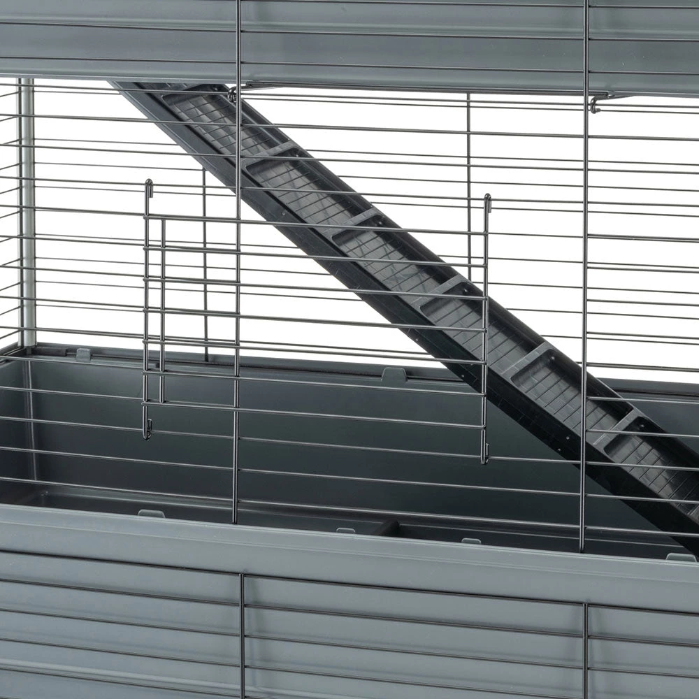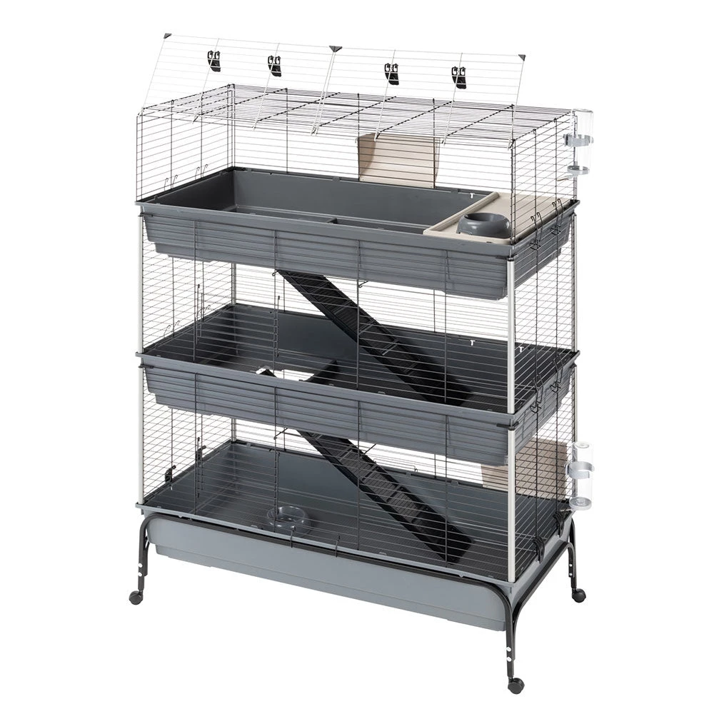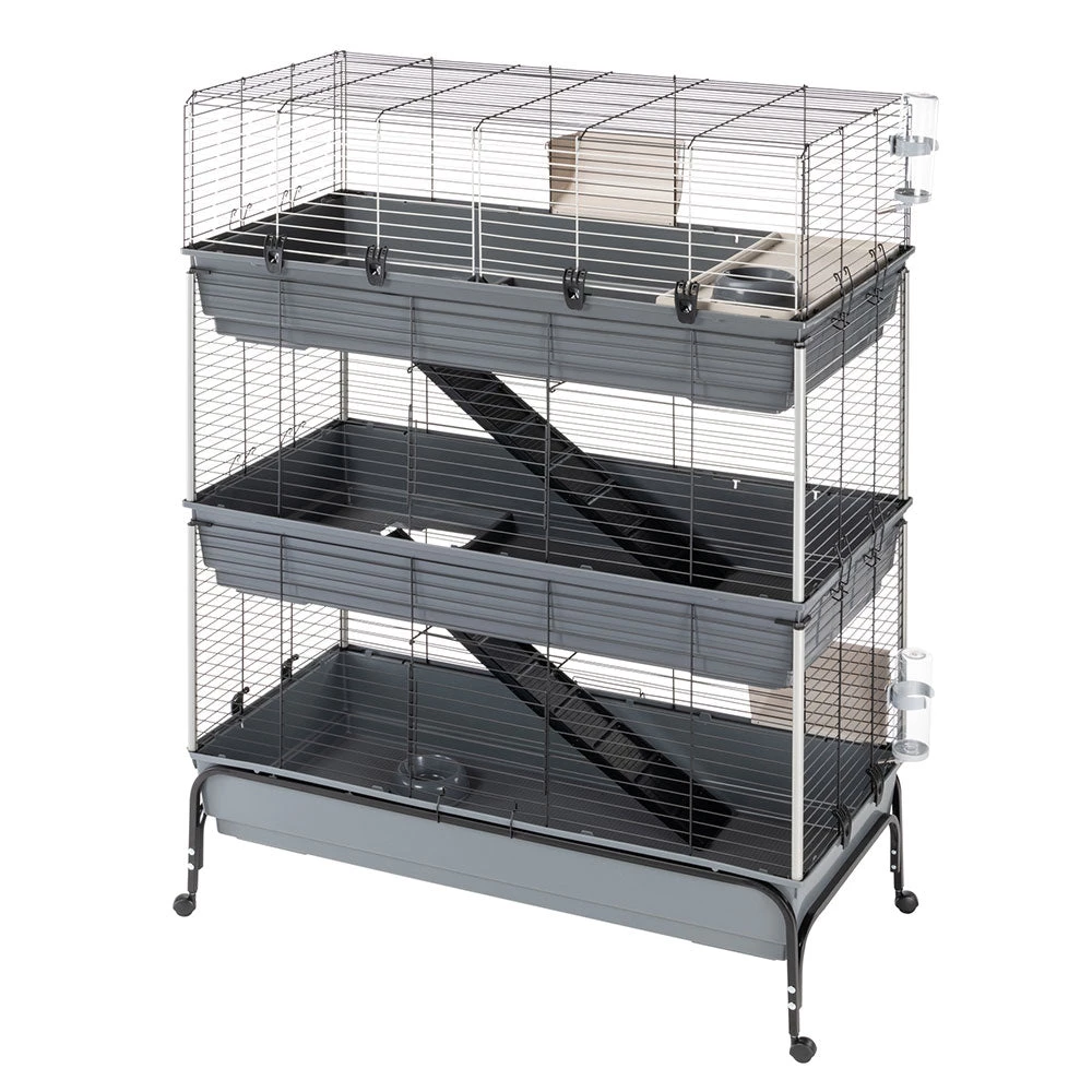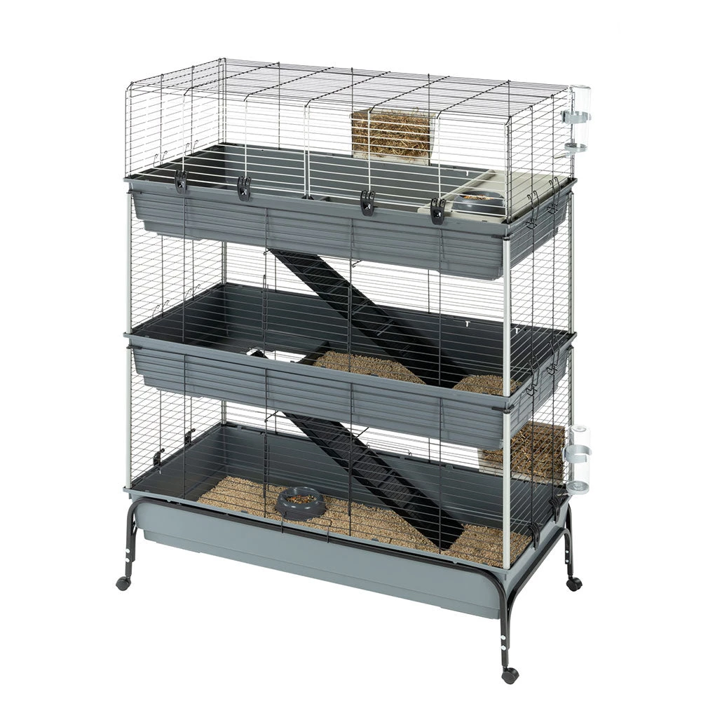 Mit Rabbit 120 Tris haben Ihre sĂŒĂen Kaninchen drei Stockwerke fĂŒr sich! Der Lebensraum, in dem auch mehrere Tiere leben können, zeichnet sich durch WeitlĂ€ufigkeit und maximalen Komfort aus. Die Metallgitterstruktur ist mit einer speziellen Korrosionsschutzfarbe behandelt, um maximale BestĂ€ndigkeit und Haltbarkeit zu gewĂ€hrleisten. ErgĂ€nzt werden diese durch seitliche KunststoffsĂ€ulen, um eine gröĂere StabilitĂ€t zu erreichen. Die drei gerĂ€umigen Böden aus thermoplastischem Harz fangen zuverlĂ€ssig Schmutz, Speisereste und Exkremente auf und verhindern, dass diese nach auĂen gelangen. Der KĂ€fig ist mit Zubehör wie Heuraufen, Trinkflaschen, SchĂŒsseln und einem RĂŒckzugshĂ€uschen fĂŒr entspannende Momente ausgestattet, das Sie ganz nach Ihren WĂŒnschen positionieren können. Zwei bequeme Holzleitern ermöglichen dem Haustier einen einfachen Zugang zu den verschiedenen Ebenen.