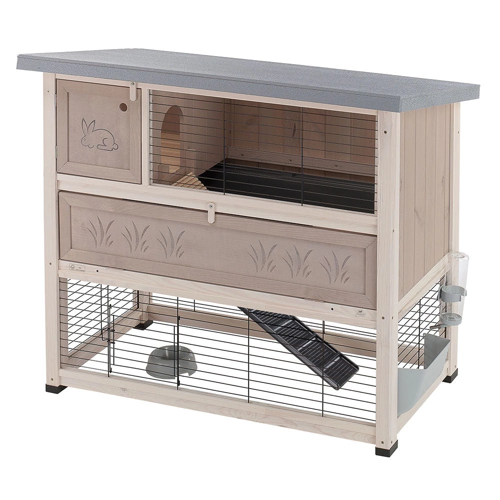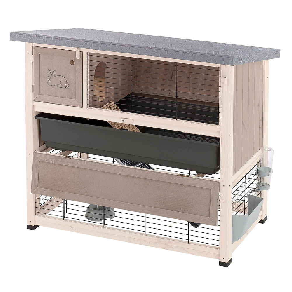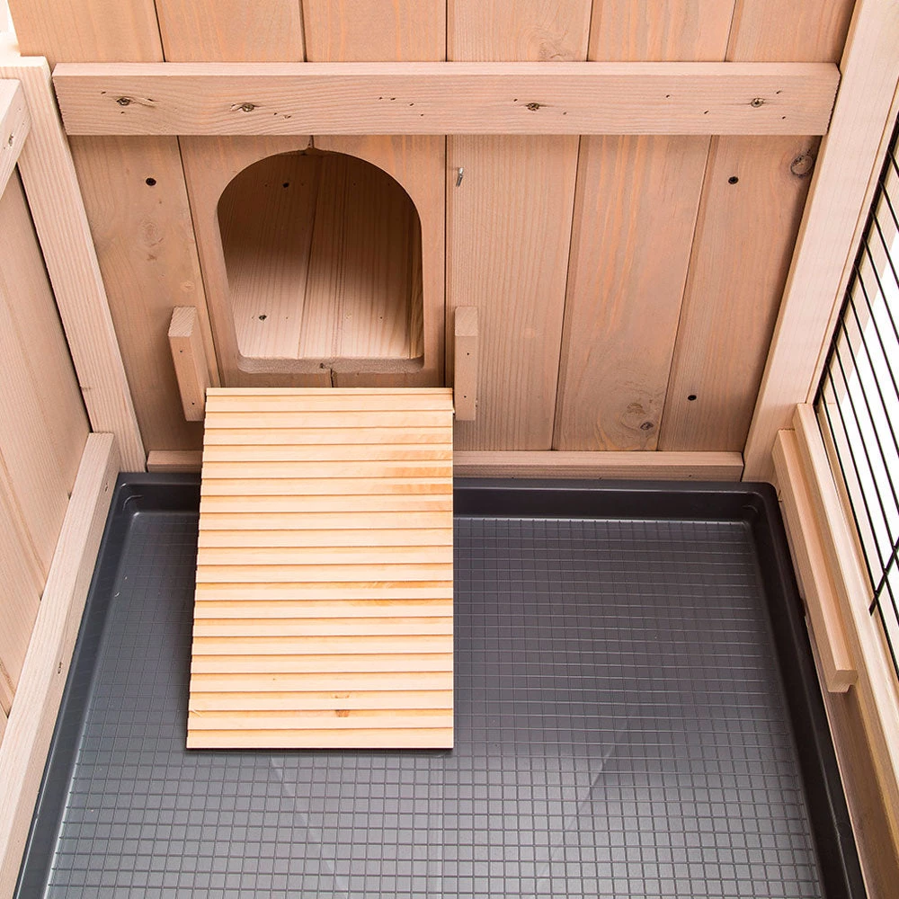 Dieser ruhigere Bereich ist mit einer groĂen Kunststofflade ausgestattet, der ideal MĂŒll und Unrat auffĂ€ngt und einer Holzrampe, die Zugang zum kleinen Kaninchenhaus bietet. Das HĂ€uschen ist direkt von vorne durch eine kleine Klappe erreichbar, die mit Sicherheitshaken fest verschlossen ist.