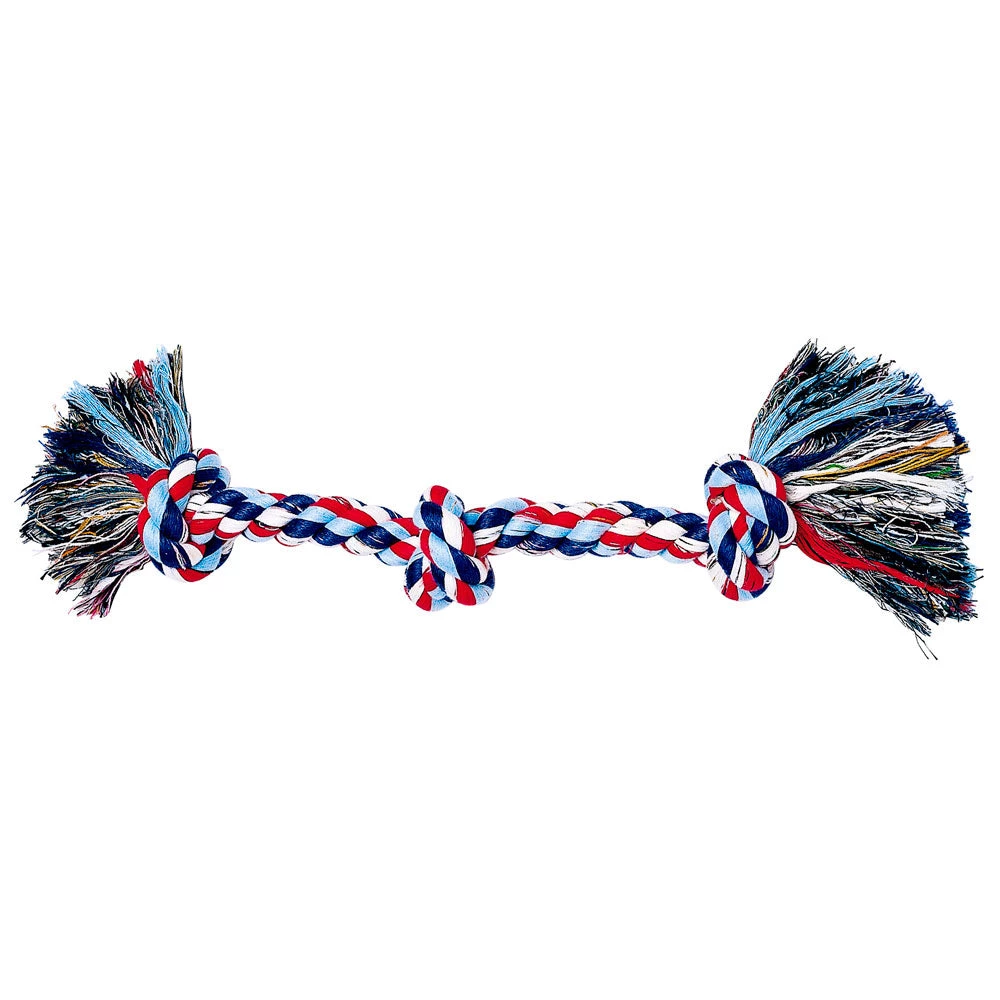 Spieltau aus Baumwolle mit Knoten in der Mitte und an den Enden fĂŒr wilde Zerrspiele mit Ihrem Hund. Baumwollspielzeuge wie dieses sind eine gute Alternative zu den herkömmlichen Hundespielzeugen aus Gummi oder Latex.