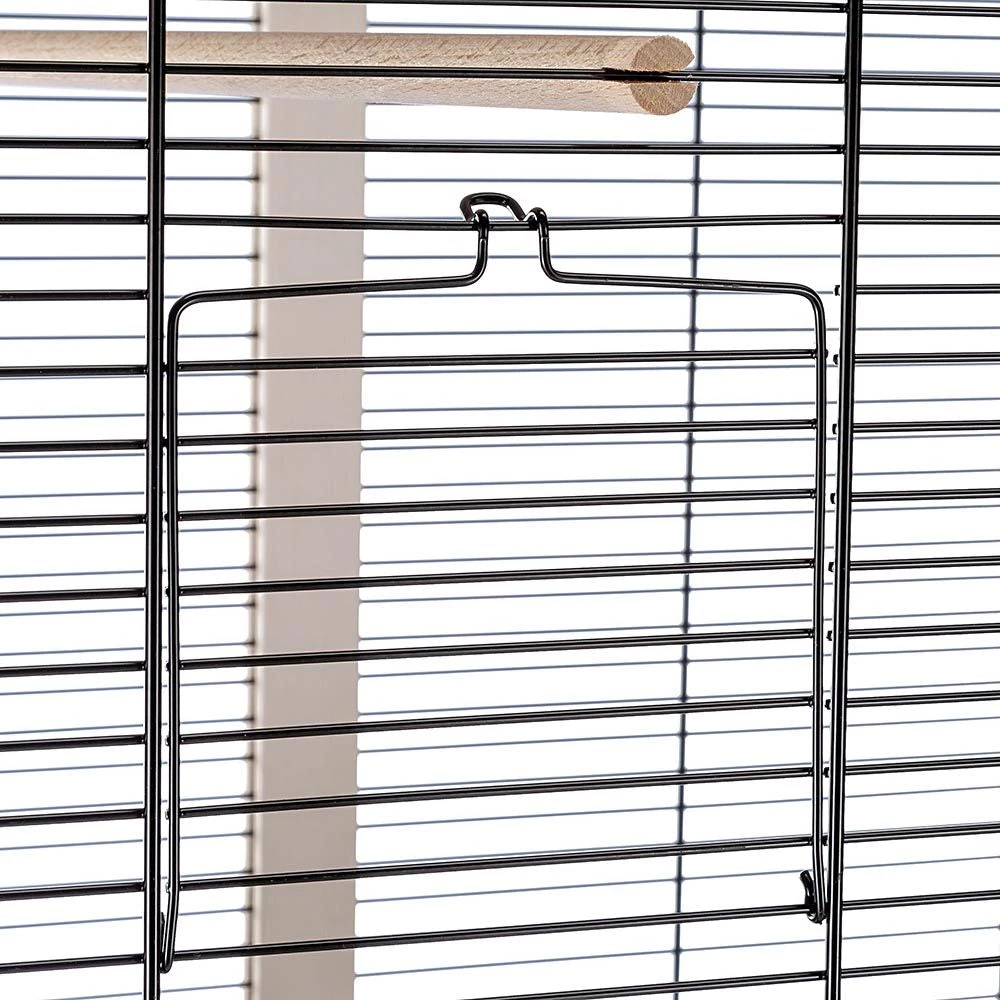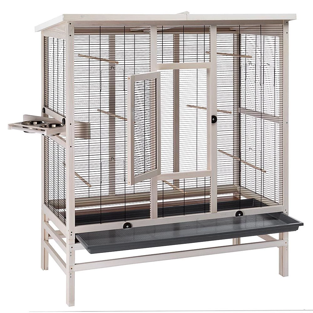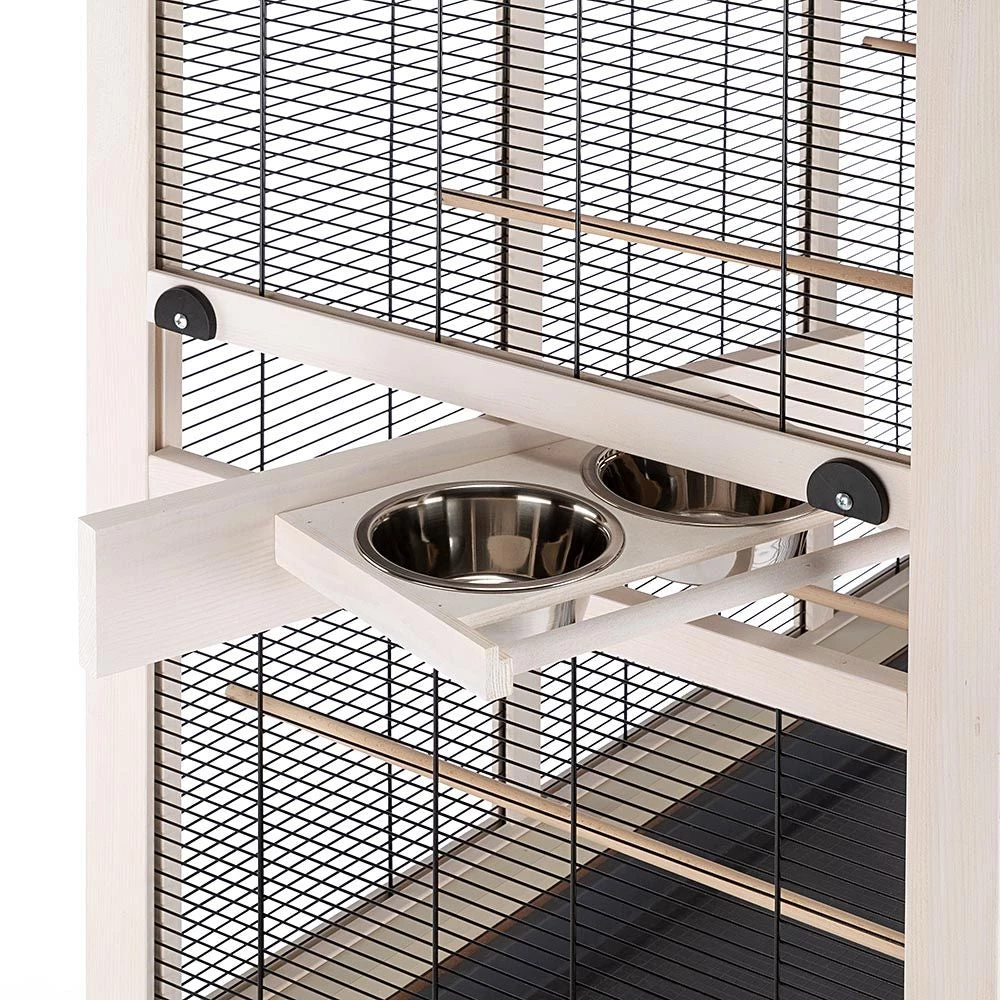 Die Voliere ist komplett ausgestattet mit unverzichtbarem Zubehör wie Sitzstangen und FutternĂ€pfen aus Edelstahl, robust und hygienisch, und einzeln entnehmbar aus dem drehbaren SchĂŒsselhalter, der das BefĂŒllen und die Reinigung erleichtert.