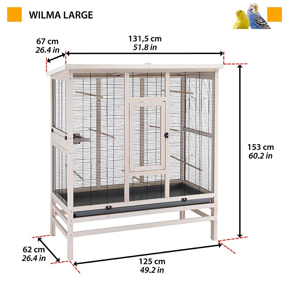 Diese raffinierte und elegante Vogelvoliere ist sehr gerĂ€umig und ideal auch fĂŒr die Unterbringung mehrerer Artgenossen: Kanarienvögel, Wellensittiche, Nymphensittiche oder andere Exoten. Wilma Large ist solide und robust, und wird unter ökologisch aus FSCâą -zertifiziertem Holz hergestellt, dh aus WĂ€ldern, die gemÀà strengen Umwelt-, Sozial- und Wirtschaftsstandards verantwortungsbewusst bewirtschaftet werden und anderen kontrollierten Quellen. Das Holz ist auĂerdem durch einen ungiftigen und schimmelhemmenden, ökologischen ImprĂ€gnierlack geschĂŒtzt, der es gegen UV-Strahlen bestĂ€ndig macht. Durch die angewandte FlieĂbeschichtungstechnologie wird das Holz wasserabweisend und langfristig geschĂŒtzt. Das stabile Gitter besteht aus lackiertem Metall.