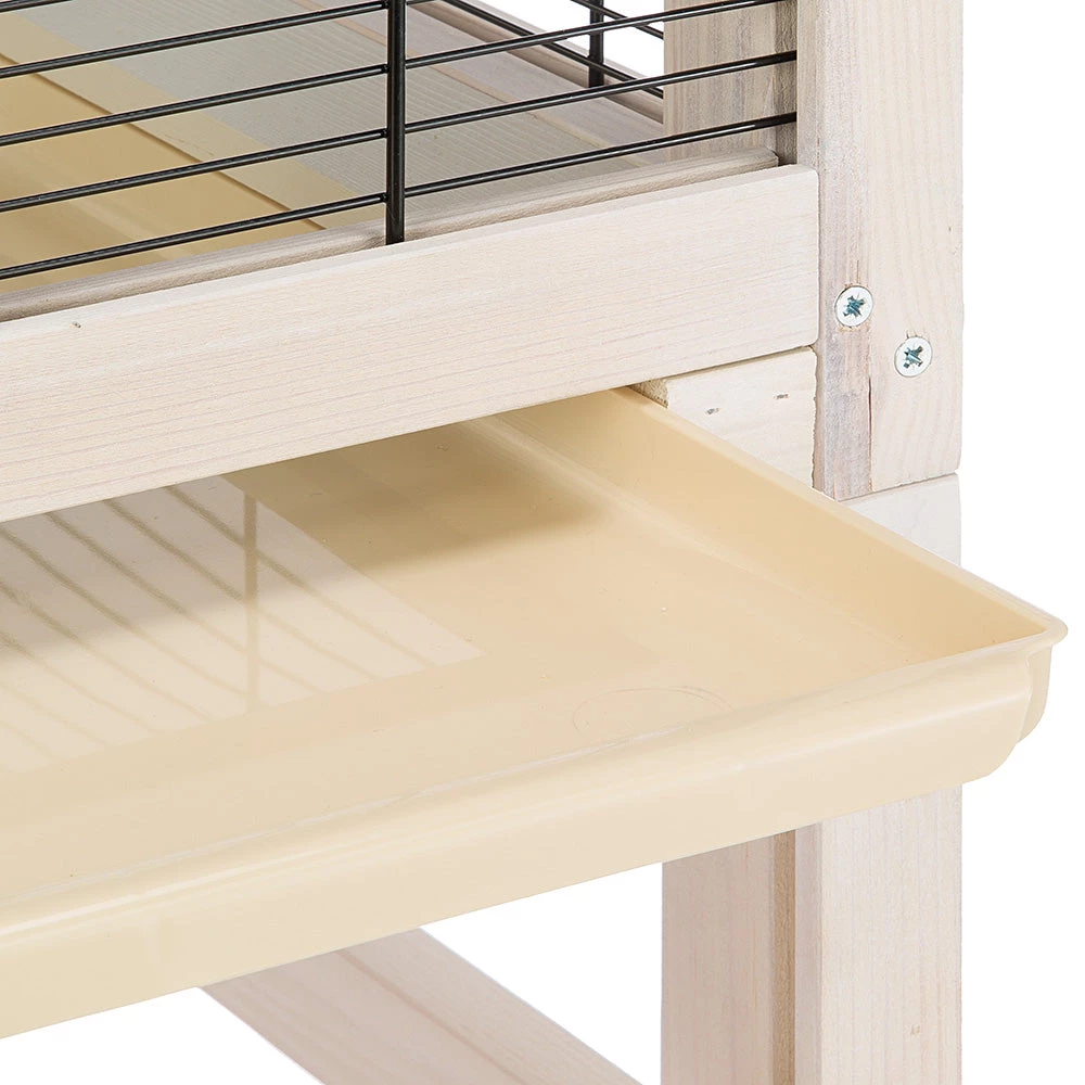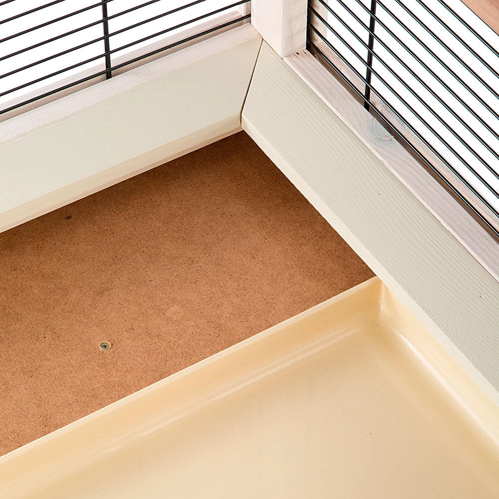 Am Boden ist der KĂ€fig mit einer groĂen herausnehmbaren KunststofFSCâą hublade ausgestattet, die perfekt die Schmutz- und Speisereste auffĂ€ngt und die ebenfalls mit einem Hakens blockiert werden kann. FĂŒr mehr MobilitĂ€t ist Wilma mit RĂ€dern ausgestattet, und die ganze Volieren wird zerlegt in einem platzsparenden Paket geliefert.