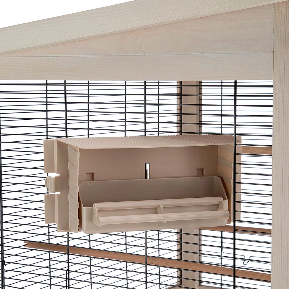 Die Voliere verfĂŒgt ĂŒber eine groĂe FronttĂŒr, die mit einem SicherheitsschlieĂhaken verschlossen wird, und zwei Seitenklappen, die ebenfalls fĂŒr die tĂ€glichen Wartungsarbeiten nĂŒtzlich sind.